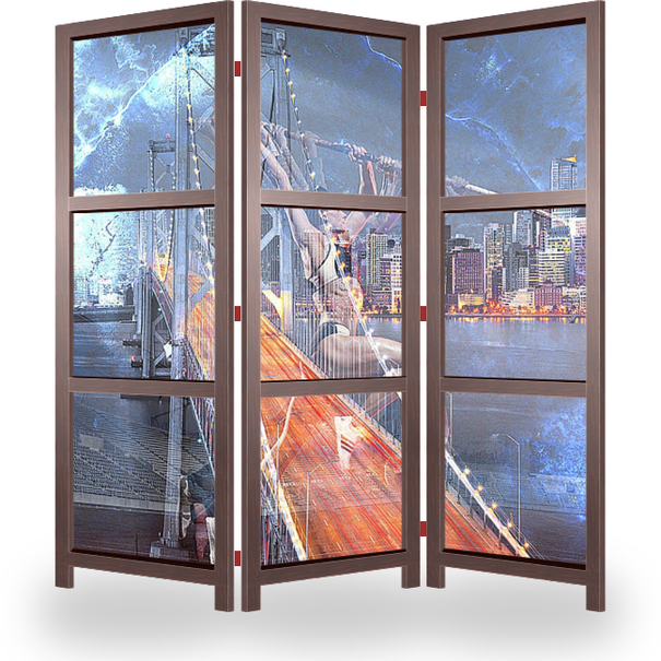 Описание ширмы Модульная картина с изображением городского пейзажа с высоты и с силуэтом спортсменки отличное и интересное дополнение к оформлению вашей комнаты