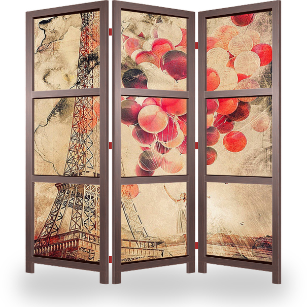 Описание ширмы Модульная картина с изображением прекрасной девушки с огромным букетом воздушных шаров на фоне Эйфелевой башни в Париже украсит и дополнит ваш интерьер.