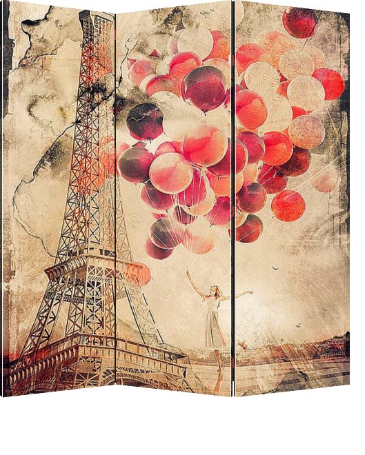 Описание ширмы Модульная картина с изображением прекрасной девушки с огромным букетом воздушных шаров на фоне Эйфелевой башни в Париже украсит и дополнит ваш интерьер.