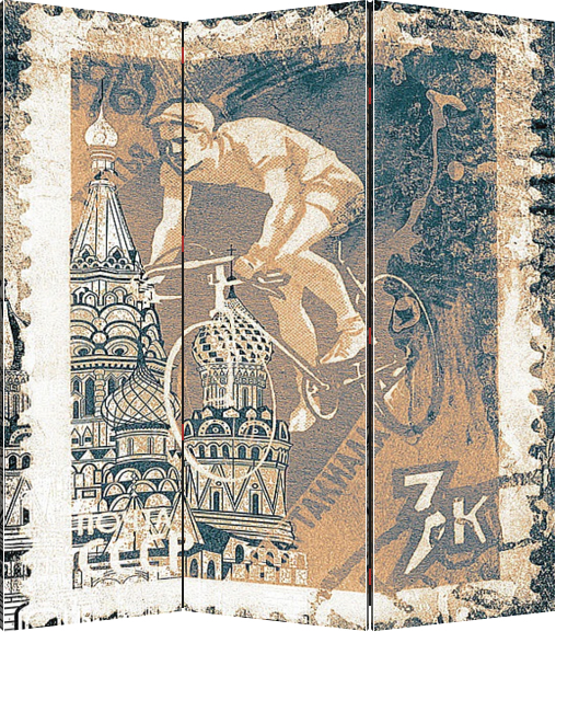 Описание ширмы Модульная картина с изображением стремительной велогонки на фоне храма Василия Блаженного в Москве украсит и дополнит ваш интерьер.
