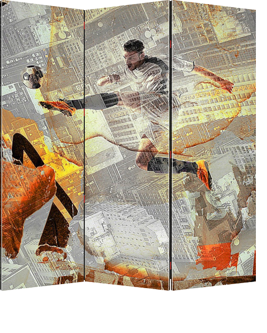 Описание ширмы Модульная картина с изображением стремительного игрока в футбол во время игры на фоне панорамного пейзажа Нью-Йорка украсит и дополнит ваш интерьер.