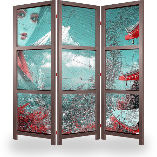 Описание ширмы Стилизованная картина, карта и японские достопримечательности, такая работа станет хорошим дополнением современного интерьера, подойдёт для гостиной или комнаты отдыха.