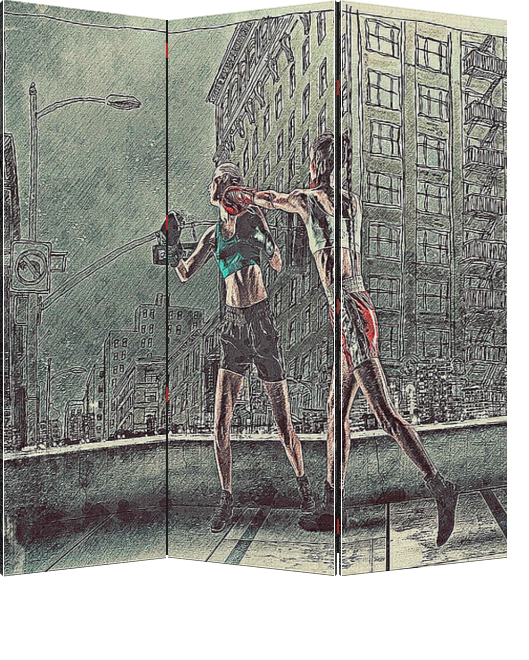 Описание ширмы Стилизованная картина, боксёры на крыше, такая работа станет хорошим дополнением современного интерьера, подойдёт для гостиной или комнаты отдыха