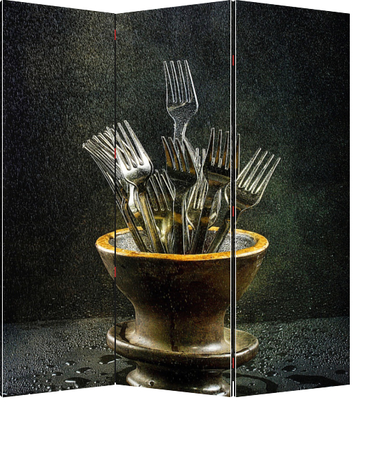 Описание ширмы Натюрморт "Букет вилок под капельным поливом" - фотоэтюд. Это попытка заставить предметы показать свои скрытые возможности в необычной для них ситуации или положении... Попытка открыть новую историю их существования.