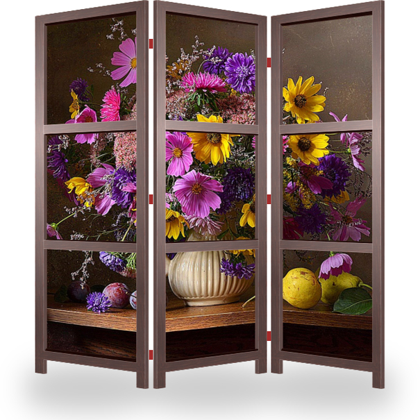 Описание ширмы Букет из цветов ранней осени (космея, топинамбур, астры, очиток, гелиопсис, степной кермек). В дополнение сливы и груши.