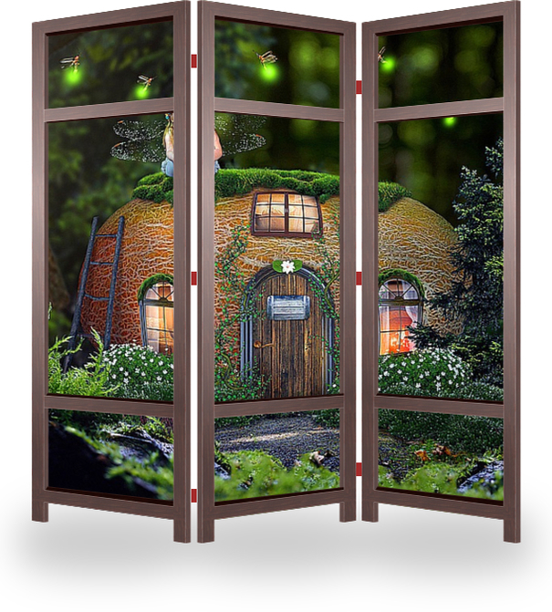 Описание ширмы Сказочная картинка про маленькую фею, ее чудесный домик и волшебный, добрый лес. Много деталей, фотографию хочется рассматривать и постоянно находить что-то новое