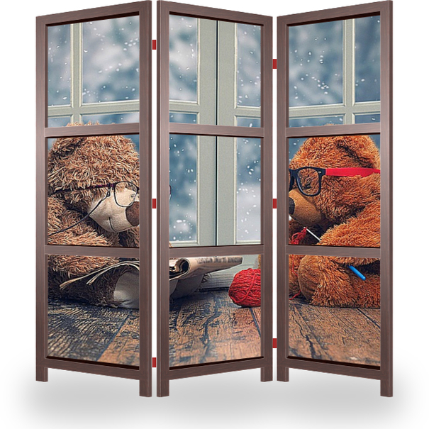 Описание ширмы Два мишки сидят у окна. За окном снег, зима, холодно. Мишки похожи на старенькую пару. Она вяжет, он читает газету. Концепция домашнего уюта, хорошего, доброго вечера. Старенькая пара, которая давно живет в месте, нежно любят друг друга.