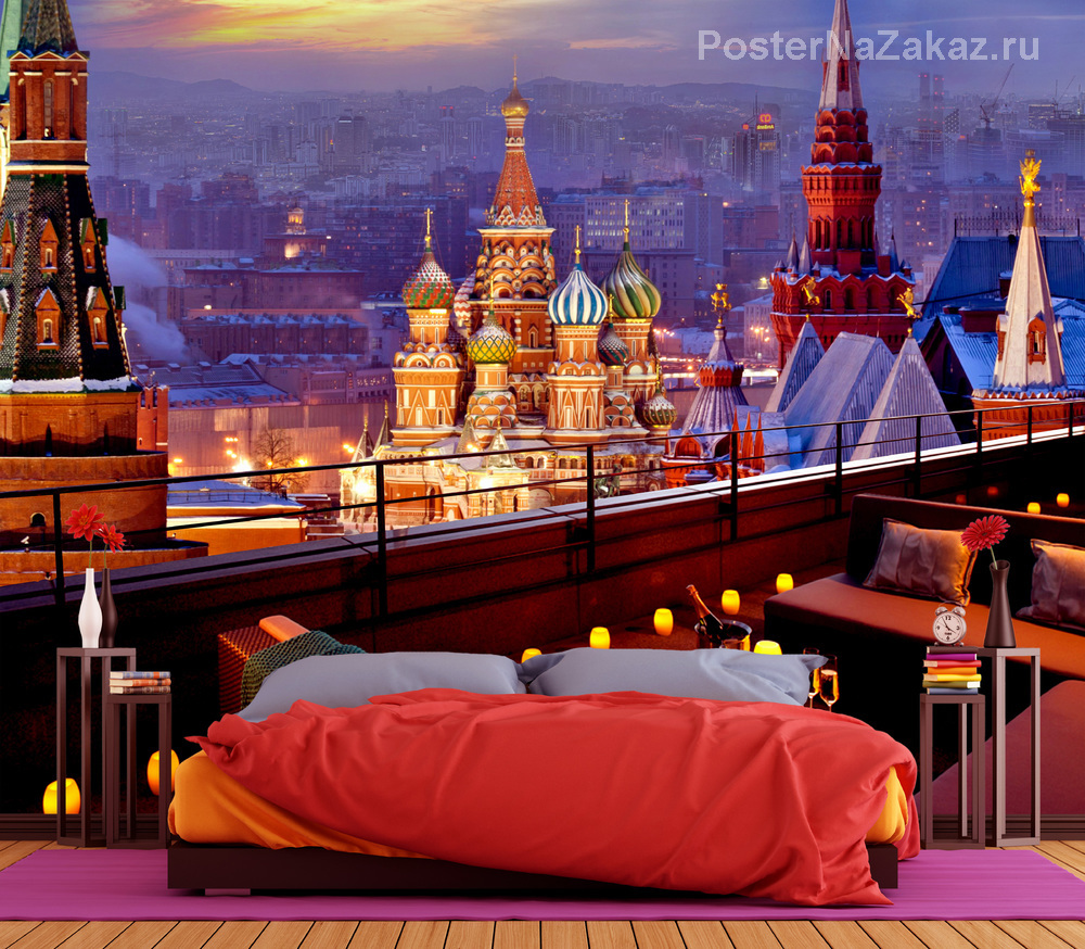 Фотообои с изображением большой террасы с видом на Кремль в Москве в огнях ночного города украсят и дополнят интерьер. Прекрасно подойдет для спальни и гостиной.