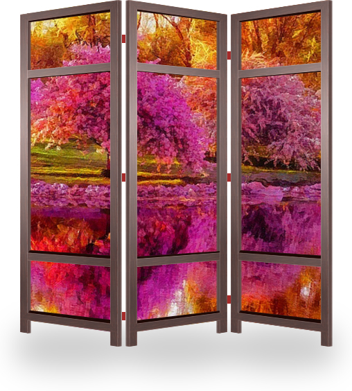 Описание ширмы На картине изображены цветущие деревья над водой. Картина выполнена в специальной технике с крупными и мелкими мазками