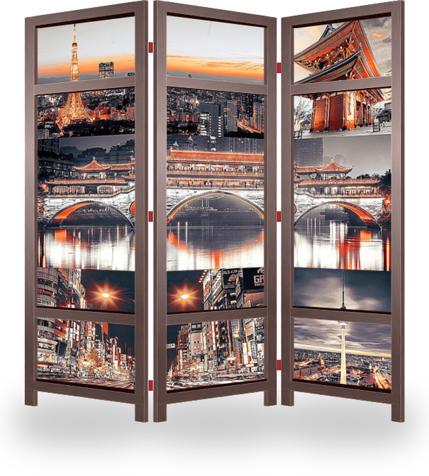 Описание ширмы Модульная картина с изображением неповторимой архитектуры Японии в монохромном исполнении с яркими акцентами украсит и дополнит Ваш интерьер. Прекрасно подойдет для спальни и гостиной.