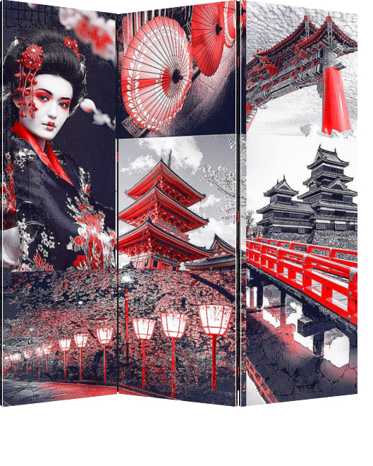 Описание ширмы Модульная картина с изображением неповторимой архитектуры и культуры Японии в монохромном исполнении с яркими акцентами украсит и дополнит Ваш интерьер. Прекрасно подойдет для спальни и гостиной.