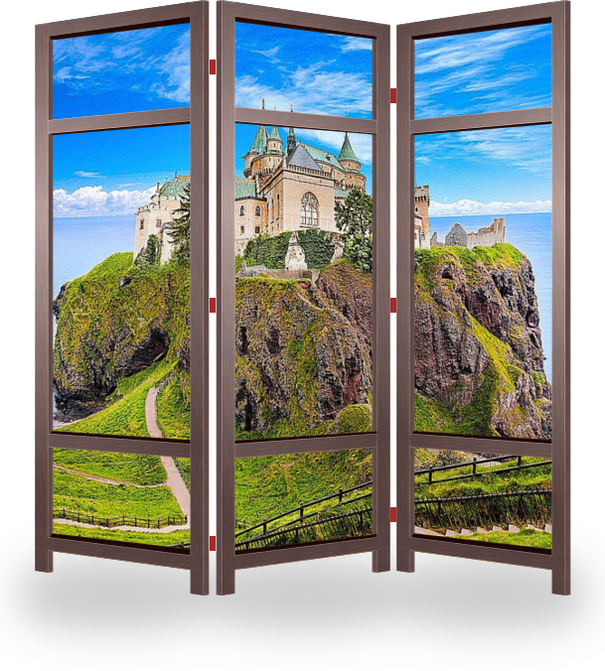 Ширма эконом отлично подойдет для временного размещения, рекламы, для отгораживания объектов интерьера и его дополнения. Лицевая сторона с изображением, обратная сторона открытый каркас