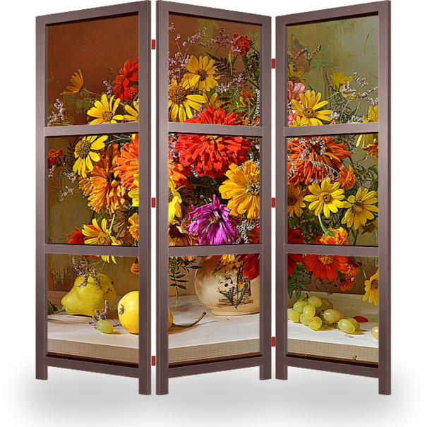 Описание ширмы Букет из цветов ранней осени (цинния разных сортов, гелиопсис, бархатцы, титония, кермек, топинамбур) в кувшине. В дополнение груши и ягоды винограда.