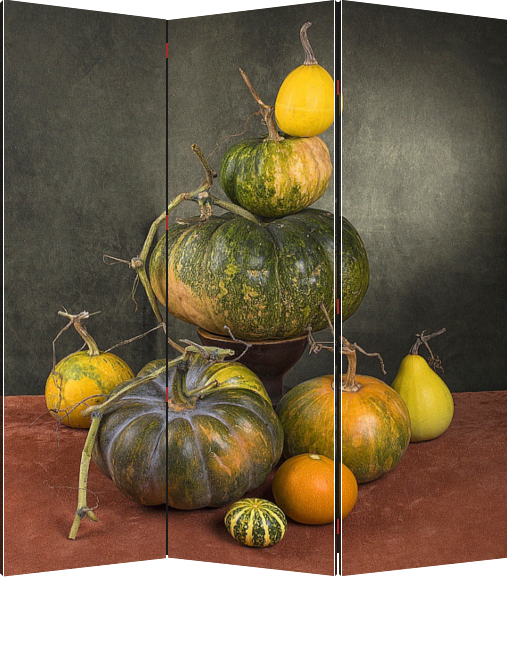 Описание ширмы Фотография урожая спелых тыкв на коричневом фоне. Продукты питания являются прекрасным объектом для фотосъёмки в различных условиях и всегда прекрасно смотрятся на любом фоне.