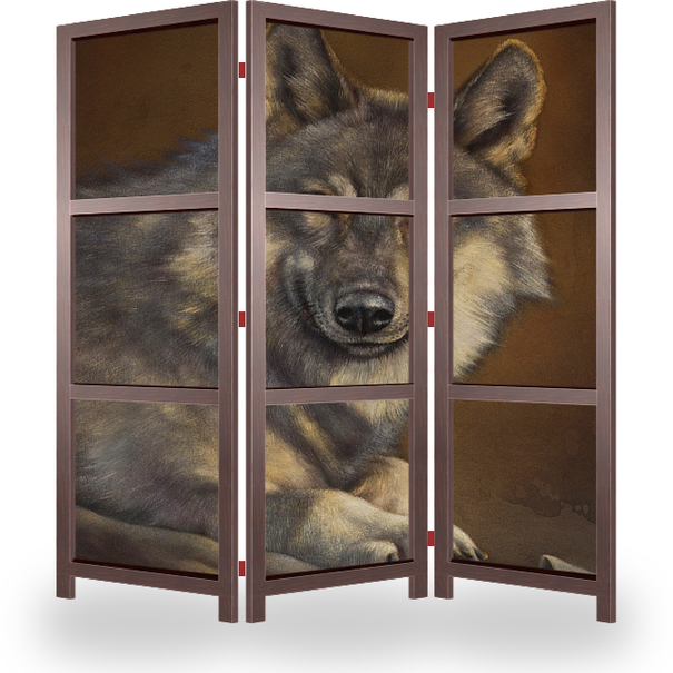 Описание ширмы Написал на бархате масляными красками портрет Волка. Хотел написать очень реалистичный портрет хищника. Волк является домашним оберегом поэтому решил написать его портрет.
