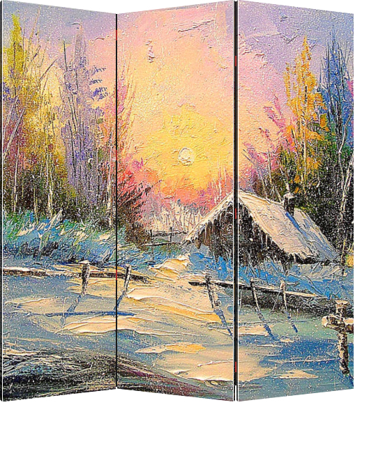 Описание ширмы Картина маслом на холсте,картина маслом для интерьера,картина маслом на подарок,живопись,импрессионизм,природа,эмоции,принт,постер,красивая картина маслом,яркая картина маслом,пейзаж,,дом,закат,деревья,лес,зима