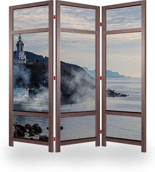 Описание ширмы Храм-маяк Святого Николая в посёлке Малореченское вблизи Алушты. Съёмка велась на рассвете при убывающем живописном тумане. Такой постер может украсить любое помещение вашего дома, квартиры, офиса, отеля, турбюро.