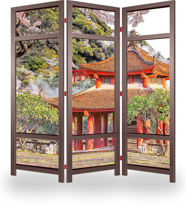Описание ширмы Модульная картина с изображением китайской архитектуры и сада, отличное и интересное дополнение к оформлению вашей комнаты