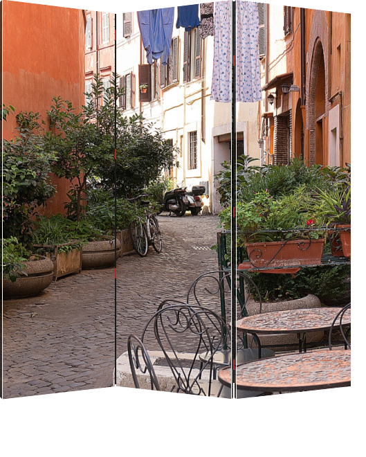 Описание ширмы Что вам приходит в голову при слове Рим? Вечный город? Набережные Тибра? Маленькие кафешки? Можно также упомянуть собор Святого Петра, Колизей, Пантеон, фонтан Треви, мост и замок Святого Ангела - Рим у каждого свой...