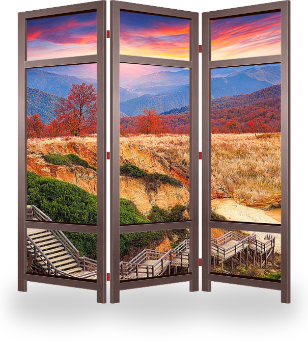 Описание ширмы Постер с изображением лестницы, ведущей со склона в горах во время золотой осени украсит и дополнит Ваш интерьер. Прекрасно подойдет для спальни и гостиной.