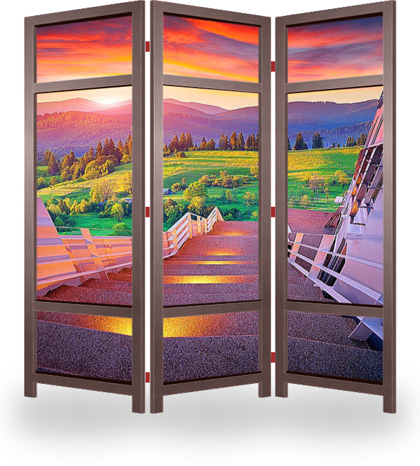 Описание ширмы Постер с изображением лестницы, ведущей с виллы на весеннюю поляну в лучах закатного солнца украсит и дополнит Ваш интерьер. Прекрасно подойдет для спальни и гостиной.