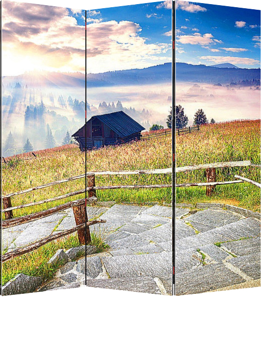Описание ширмы Постер с изображением лестницы, ведущей со склона среди холмов к старинному домику украсит и дополнит Ваш интерьер. Прекрасно подойдет для спальни и гостиной.