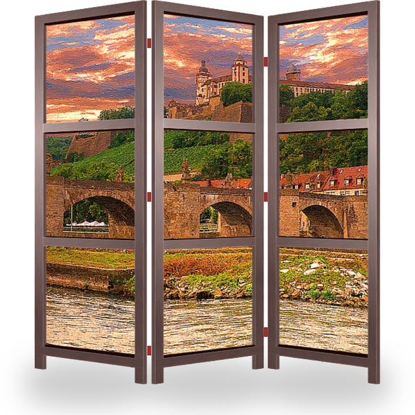 Описание ширмы На высоком холме над городом Вюрцбургом, в Баварии, стоит замок. Город и предместья замка соединяет старый мост, через реку Майн. Мост украшают статуи святых.