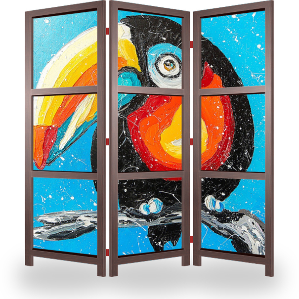 Описание ширмы Любовь Купцова - художник, работающий с различными материалами и техниками. Прежде всего это масло и акварель. Также занимается вышивкой, прижиганием по ткани, росписью стен.Самыми любимыми сюжетами являются животные, птицы, цветы и люди. Особое мест