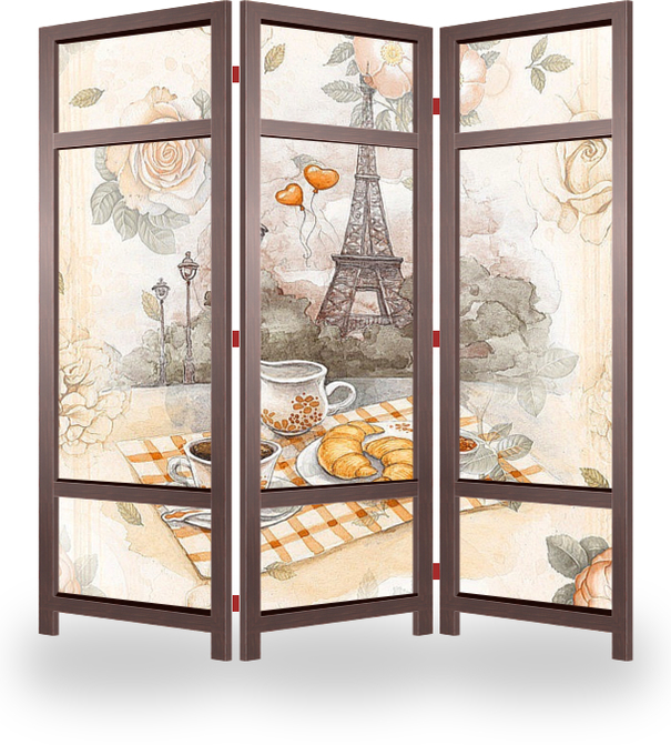 Описание ширмы Постер с изображением легкого завтрака на фоне Эйфелевой башни в Париже в окружении крупных цветков розы в стиле прованс украсит и дополнит Ваш интерьер. Прекрасно подойдет для спальни и гостиной.