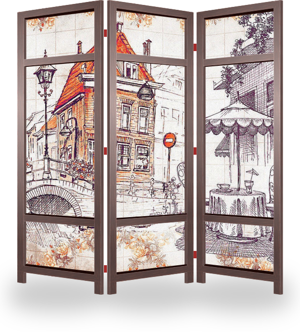 Описание ширмы Постер с изображением романтичного ресторанчика на улице Амстердама в стиле прованс украсит и дополнит Ваш интерьер. Прекрасно подойдет для спальни и гостиной.