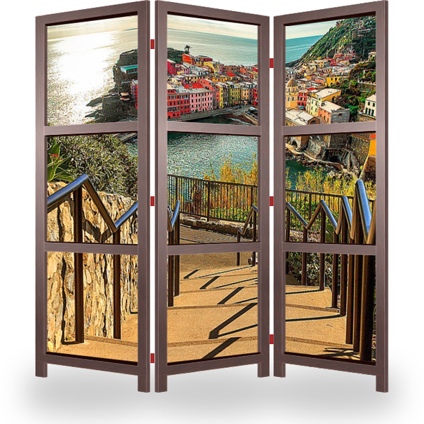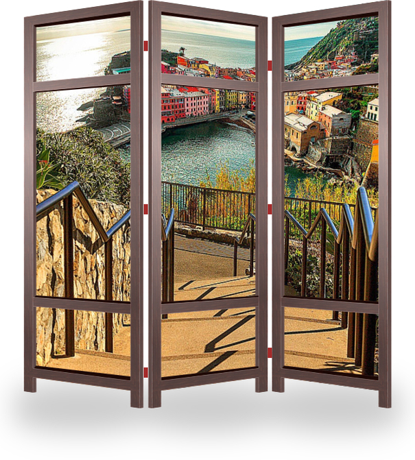 Описание ширмы Постер с изображением лестницы, с которой открывается завораживающий пейзаж на красочный остров украсит и дополнит Ваш интерьер. Прекрасно подойдет для спальни и гостиной.