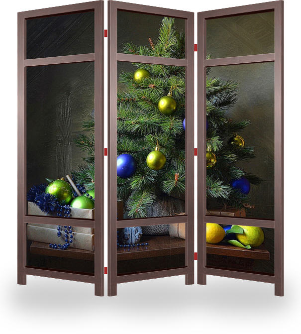 Описание ширмы Искусственная ёлка, украшенная новогодними игрушками. Заготовленные подарки и игрушки в коробках, лимоны.