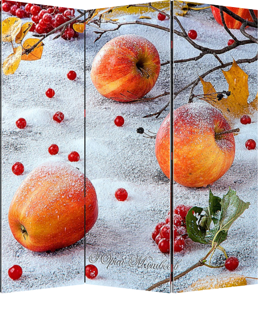 Описание ширмы Ветер угнал пургу, Солнечный луч –каприз. Яблоки на снегу, Сказка, набросок, эскиз. Как, почему, зачем? Вторит вопросу вопрос. Вот вам одна из тем: Кто их сюда занёс. Пурга погостила в саду, Устроила свой карнавал. Яблоки на снегу. Такого