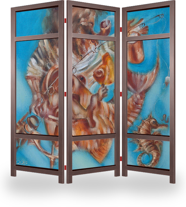 Описание ширмы Работа выполнена маслом на холсте. Будет интересна любителям современного искусства - стилей авангард, поп-арт. Прекрасно дополнит интерьер любого помещения от офиса до жилой комнаты. Станет отличным подарком.