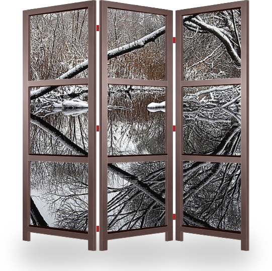 Описание ширмы Теплые зимы уже не удивляют и даже не огорчают. Часто стоит густой зимний туман и создает необычные графические картины из деревьев , а еще талая вода придает особый колорит .