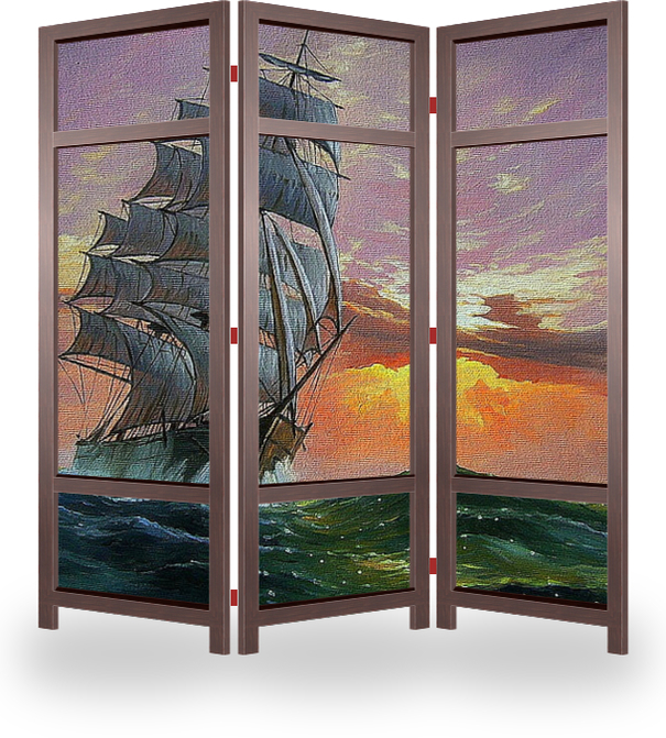 Описание ширмы Плывущий по волнам корабль, это одно из самых мощных символов для привлечения материального благополучия, паруса корабля наполнены ветром — это удача и успех. Автор картины художник Сергей Кольба.