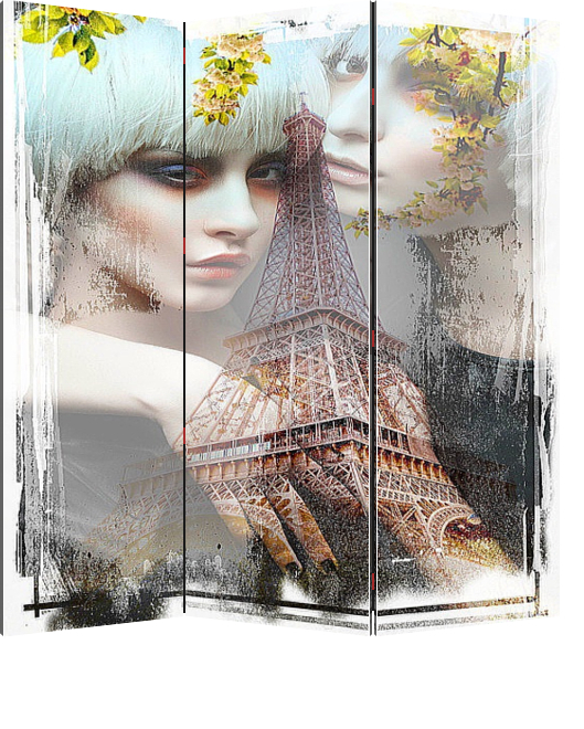 Описание ширмы Постер с изображением женского портрета на фоне знаменитой Эйфелевой башни среди цветущих веточек в стиле лофт украсит и дополнит Ваш интерьер. Прекрасно подойдет для спальни и гостиной.