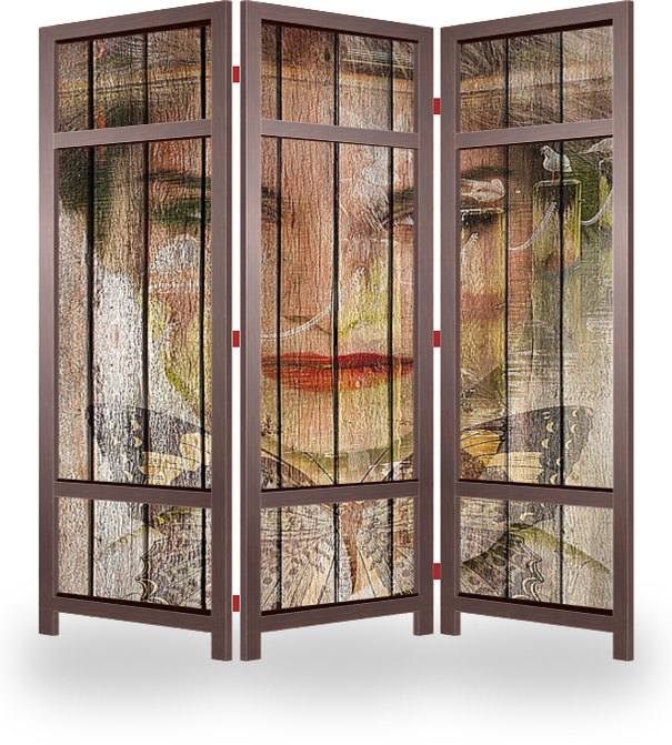 Описание ширмы Постер с изображением женского портрета, с элементами природы и бабочек, отличное и интересное дополнение к оформлению вашей комнаты и интерьера