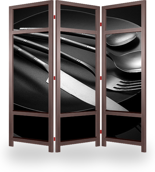 Описание ширмы Элегантная черно-белая композиция столовых приборов на черной тарелке в стиле минимализм.