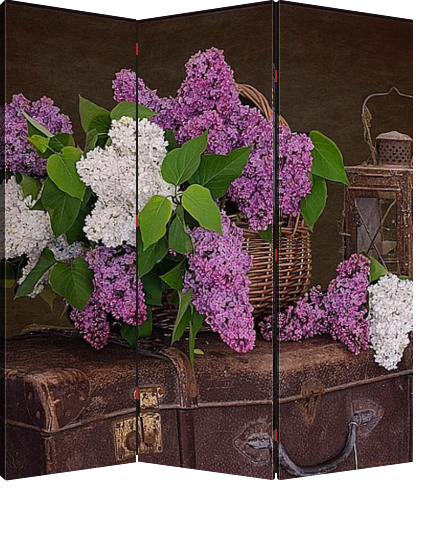 Описание ширмы Натюрморт из серии" Старые вещи" со старым чемоданом, старинной лампой и ярким букетом сирени, построен на контрастах. Такой постер может может украсить любое помещение вашего дома, квартиры, отеля