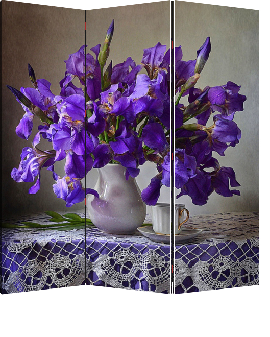 Описание ширмы Букет фиолетово-сиреневых ирисов в кувшине. Белая кружевная хлопчатобумажная скатерть. Чашка с кофе.