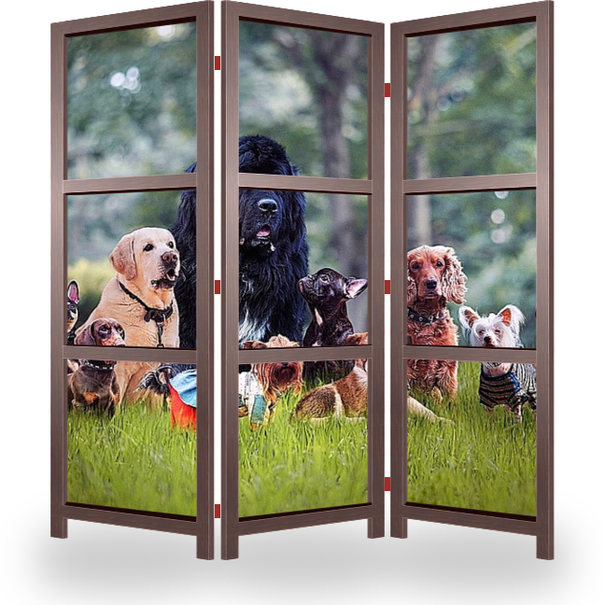 Описание ширмы Очень много разных собак. Фотография подойдет для зоо магазинов, для услуг по выгулу животных