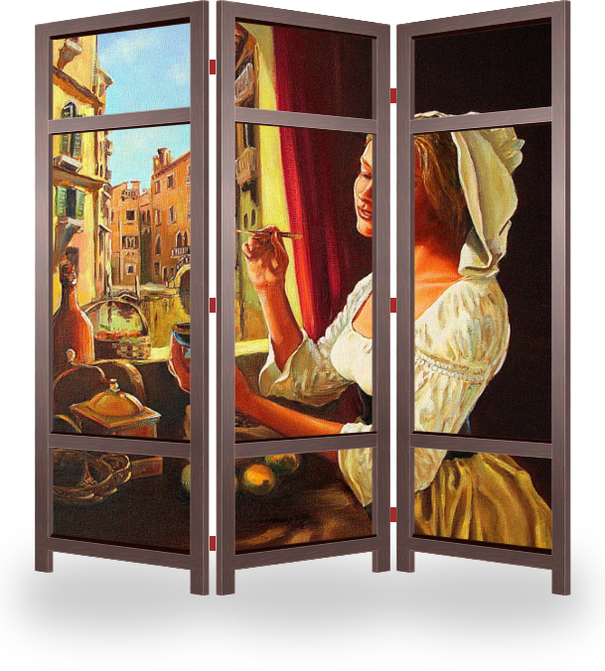 Описание ширмы "Шоколадница" холст, масло. Венецианские мореплаватели первыми привезли в Европу шоколад. В те времена он сильно отличался от привычного нам сегодня продукта. Это был жидкий, горячий и острый напиток. Отлично впишется в интерьер кухни, кафе, рестор