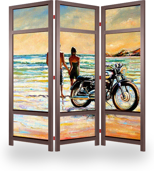 Описание ширмы "Прошлым летом" картина маслом на холсте. Романтическое путешествие на мотоцикле, что может быть лучше! Картина станет отличным подарком для любителей романтики, путешествий и мотоциклов.