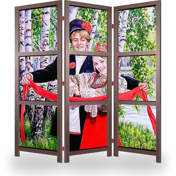 Описание ширмы Момент ухаживания русской пары, выраженный языком народного танца. Танец наполнен глубоким лирическим смыслом. Мужчина – энергичный и мужественный, женщина – величава и горда. Русская природа лишь подчеркивает важность момента. Такая картина займет д