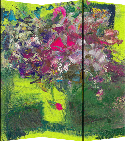 Описание ширмы живописный этюд с букетом на зелёном фоне выявляющем яркость цвета и превращающий холст в выразительный ковер.