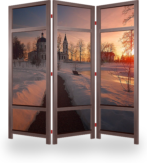 Описание ширмы Закат у храма Святителя Николая в деревне Мансурово в ближайшем Подмосковье