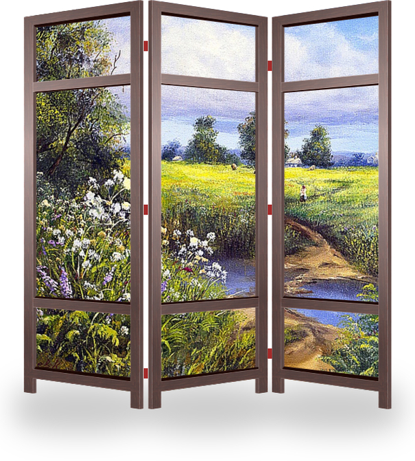 Описание ширмы Мы родом из детства...Там просто, уютно и понятно.Деревня, лето, неторопливо жующие траву коровы,заботливые руки бабушки, которые создают этот оазис беспечности.Полдень-пора идти на дойку, чтобы вечером внук, испив чашку молока, не покидал этот оазис
