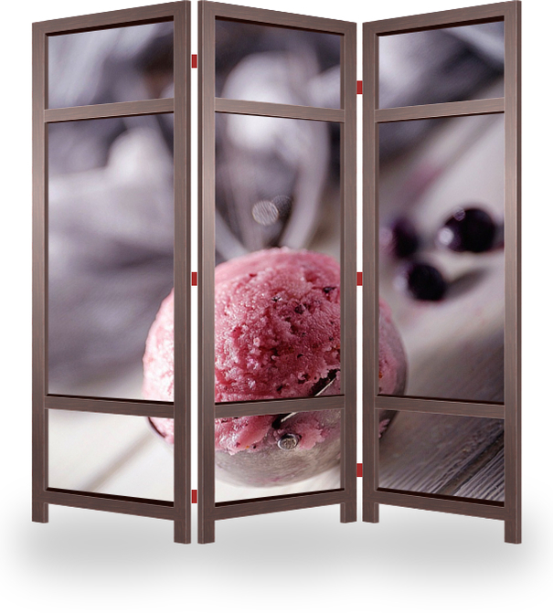 Описание ширмы Ложка с ягодным мороженным. Акцент на мороженное. Все остальное пространство уходит в легкое боке светло- серого цвета, что выгодно подчеркивает главный объект.