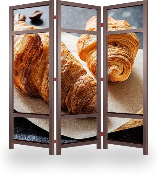 Описание ширмы Парочка горячих, свежевыпеченных круассанов на бумаге для запекания крупным планом.